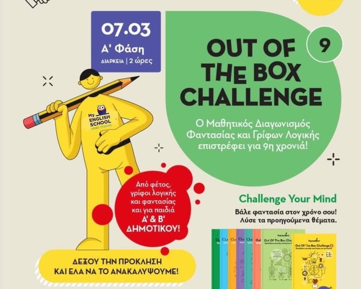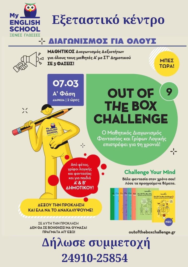 Έναν ξεχωριστό μαθητικό διαγωνισμό δημιουργικής σκέψης φιλοξενεί φέτος στα Φάρσαλα το My English School, λειτουργώντας ως εξεταστικό κέντρο για τον διαγωνισμό “Out of the Box Challenge”, έναν θεσμό που πραγματοποιείται για 9η συνεχόμενη χρονιά.