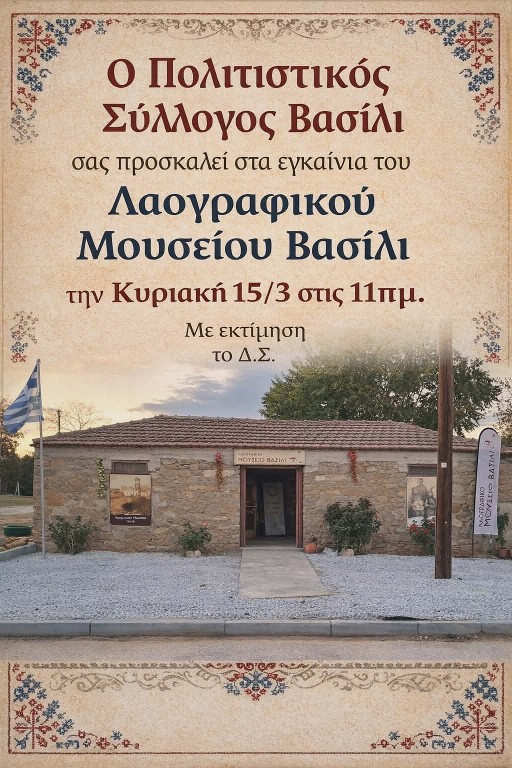 Την εκδήλωση διοργανώνει ο Πολιτιστικός Σύλλογος Βασίλι. Με αφορμή τα εγκαίνια, το Διοικητικό Συμβούλιο του συλλόγου απευθύνει ανοιχτή πρόσκληση σε όλους τους κατοίκους της επαρχίας να δώσουν το «παρών» και να γνωρίσουν από κοντά τα εκθέματα που συνθέτουν την πολιτιστική ταυτότητα του τόπου.