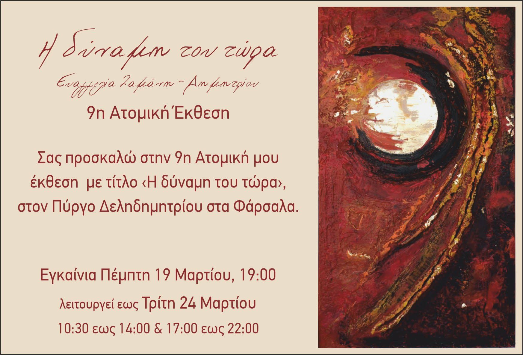 Σας προσκαλώ στην 9η Ατομική μου έκθεση με τίτλο «Η δύναμη του τώρα», στον Πύργο Δεληδημητρίου στα Φάρσαλα.