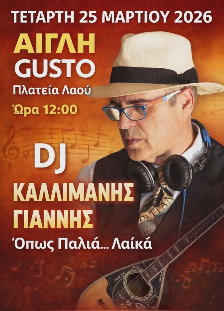 Μουσικό μεσημέρι ετοιμάζει το κατάστημα «Αίγλη Gusto» στην Πλατεία Λαού, προσκαλώντας το κοινό να γιορτάσει την ημέρα της εθνικής επετείου με καλό ελληνικό τραγούδι.