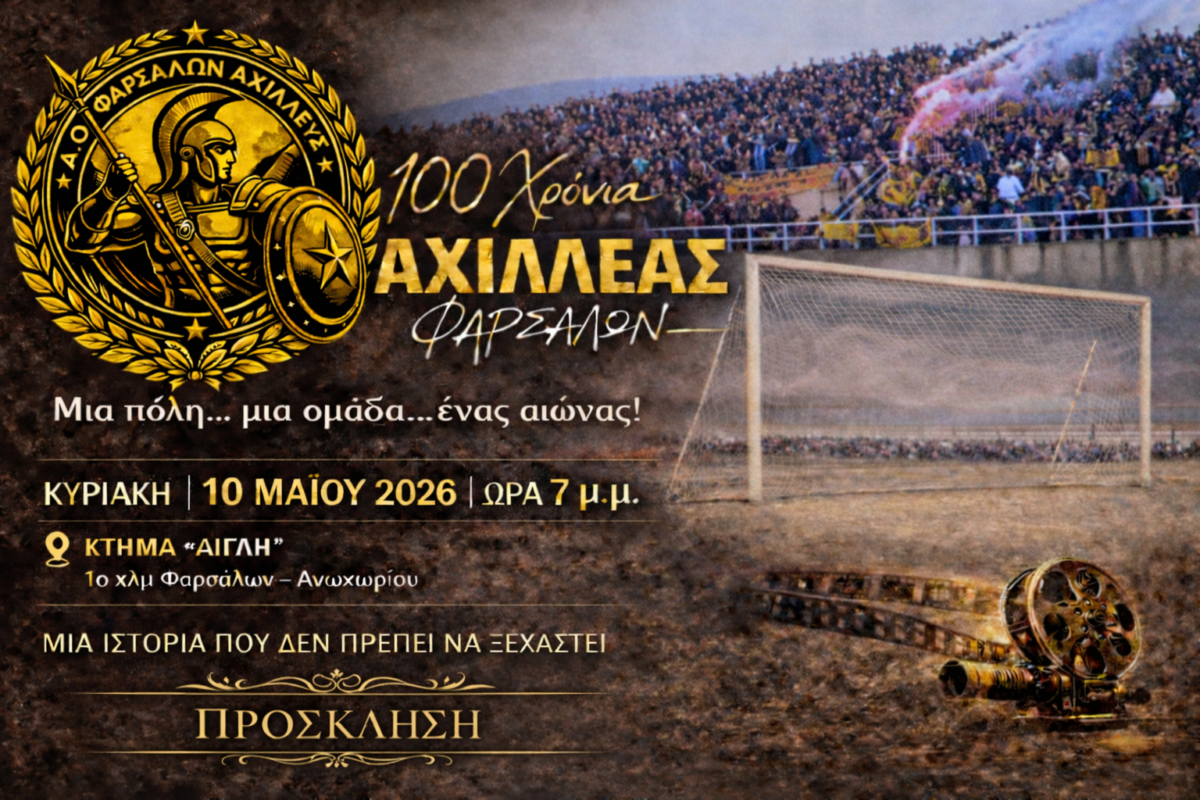 Με ιδιαίτερη χαρά και συγκίνηση, με αφορμή τη μεγάλη επετειακή εκδήλωση για τη συμπλήρωση 100 χρόνων ιστορίας του Αχιλλέα Φαρσάλων και την προβολή του ντοκιμαντέρ, θα ήθελα να απευθύνω ανοιχτό κάλεσμα προς όλους τους αθλητικούς, πολιτιστικούς Συλλόγους της επαρχίας μας, αλλά και κάθε είδους Σύλλογο και Ένωση που εδρεύει και δραστηριοποιείται στα Φάρσαλα και στα χωριά μας.
