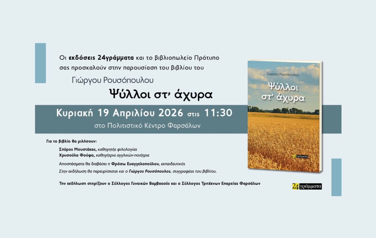 Οι εκδόσεις 24γράμματα και το βιβλιοπωλείο Πρότυπο σας προσκαλούν στην παρουσίαση του βιβλίου του Γιώργου Ρουσόπουλου «Ψύλλοι στ’ άχυρα» την Κυριακή 19 Απριλίου 2026 στις 11:30 στο Πολιτιστικό Κέντρο Φαρσάλων