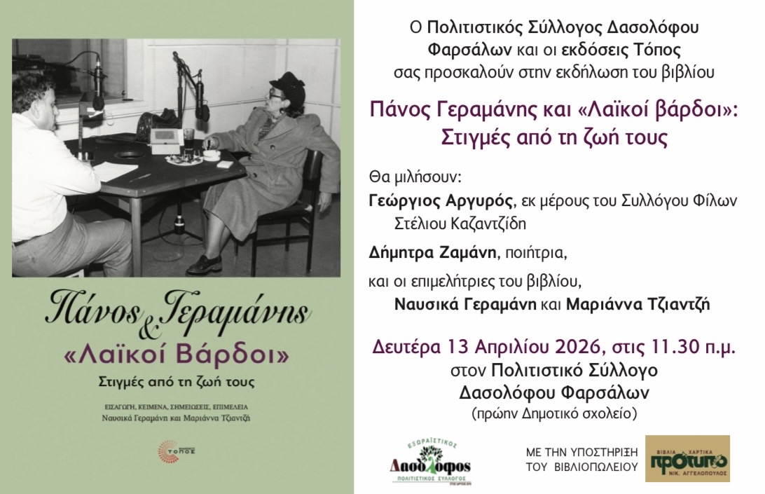 Μια ξεχωριστή εκδήλωση αφιερωμένη στη μνήμη και το έργο του εμβληματικού δημοσιογράφου και παραγωγού Πάνου Γεραμάνη διοργανώνουν ο Πολιτιστικός Σύλλογος Δασολόφου Φαρσάλων και οι εκδόσεις Τόπος. Η εκδήλωση αφορά την παρουσίαση του βιβλίου με τίτλο «Πάνος Γεραμάνης και “Λαϊκοί Βάρδοι”: Στιγμές από τη ζωή τους», το οποίο περιλαμβάνει εισαγωγή, κείμενα και επιμέλεια από τις Ναυσικά Γεραμάνη και Μαριάννα Τζιαντζή.
