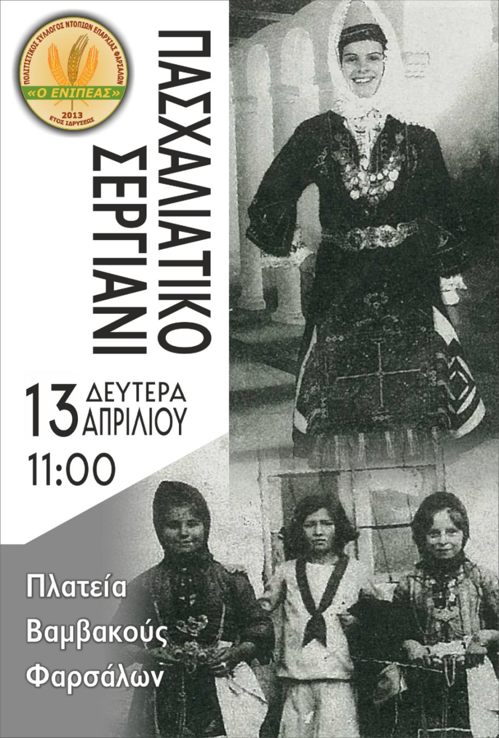 Ο Σύλλογος Ντόπιων Επαρχίας Φαρσάλων ο ΕΝΙΠΕΑΣ διοργανώνει τη Δευτέρα (13/04) του Πάσχα στις 11 το πρωί στην πλατεία της Βαμβακούς Φαρσάλων το «2ο Πασχαλινό Σεργιάνι». Ένα έθιμο της περιοχής, το οποίο γινόταν στα περισσότερα χωριά το τριήμερο του Πάσχα.