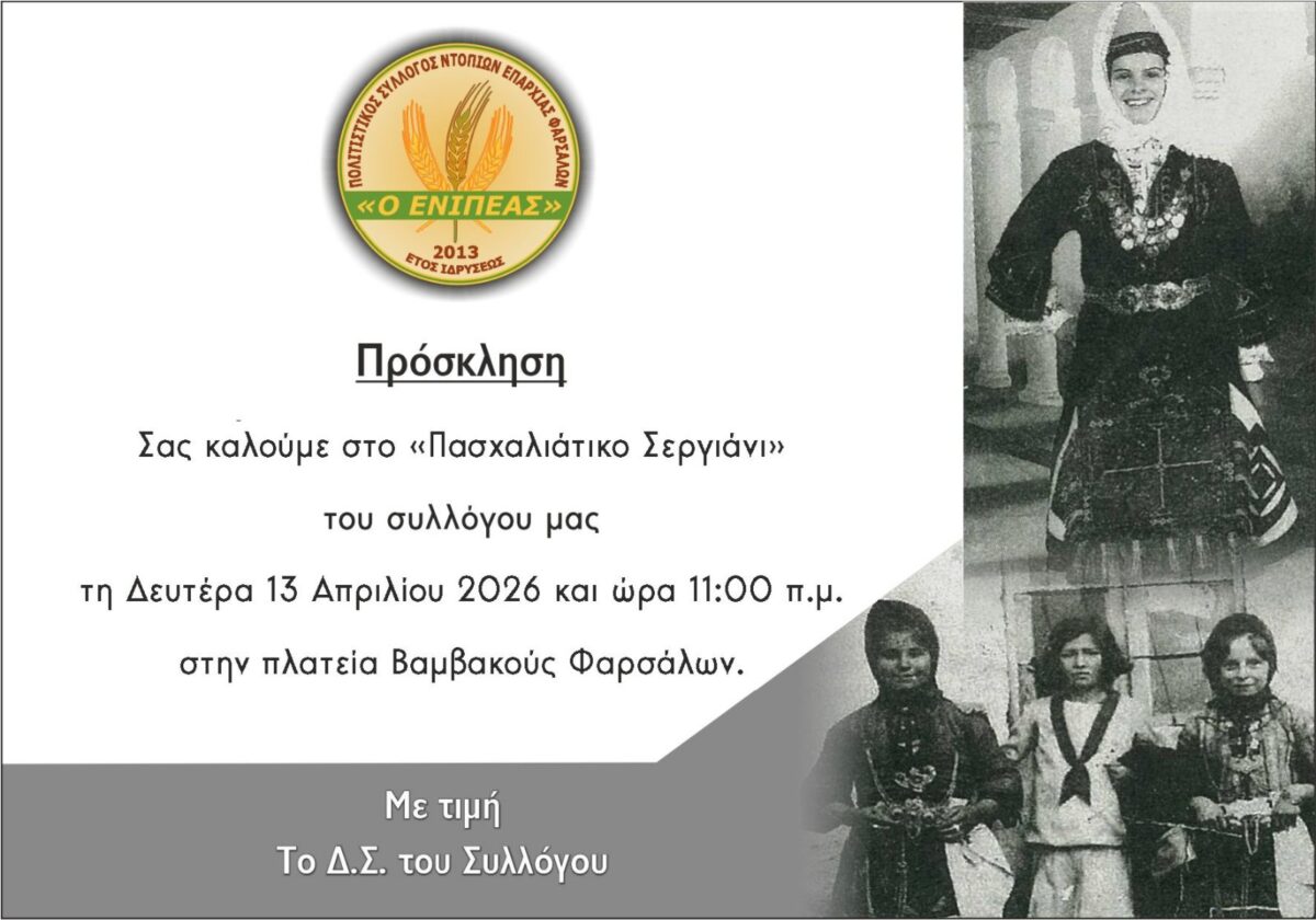 Ο Σύλλογος Ντόπιων Επαρχίας Φαρσάλων ο ΕΝΙΠΕΑΣ διοργανώνει τη Δευτέρα (13/04) του Πάσχα στις 11 το πρωί στην πλατεία της Βαμβακούς Φαρσάλων το «2ο Πασχαλινό Σεργιάνι». Ένα έθιμο της περιοχής, το οποίο γινόταν στα περισσότερα χωριά το τριήμερο του Πάσχα.