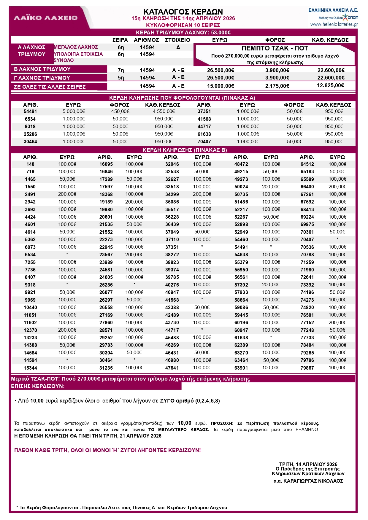 Δείτε τον Πίνακα των Κερδών της 15ης Κλήρωσης 14 Απριλίου 2026