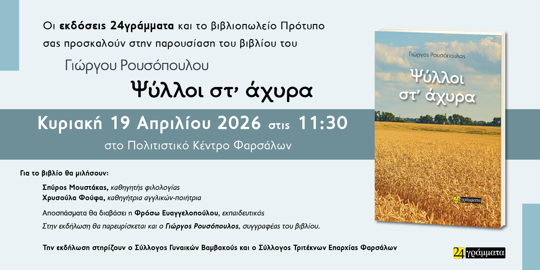 Οι εκδόσεις 24γράμματα και το βιβλιοπωλείο Πρότυπο σας προσκαλούν στην παρουσίαση του βιβλίου του Γιώργου Ρουσόπουλου «Ψύλλοι στ’ άχυρα» την Κυριακή 19 Απριλίου 2026 στις 11:30 στο Πολιτιστικό Κέντρο Φαρσάλων