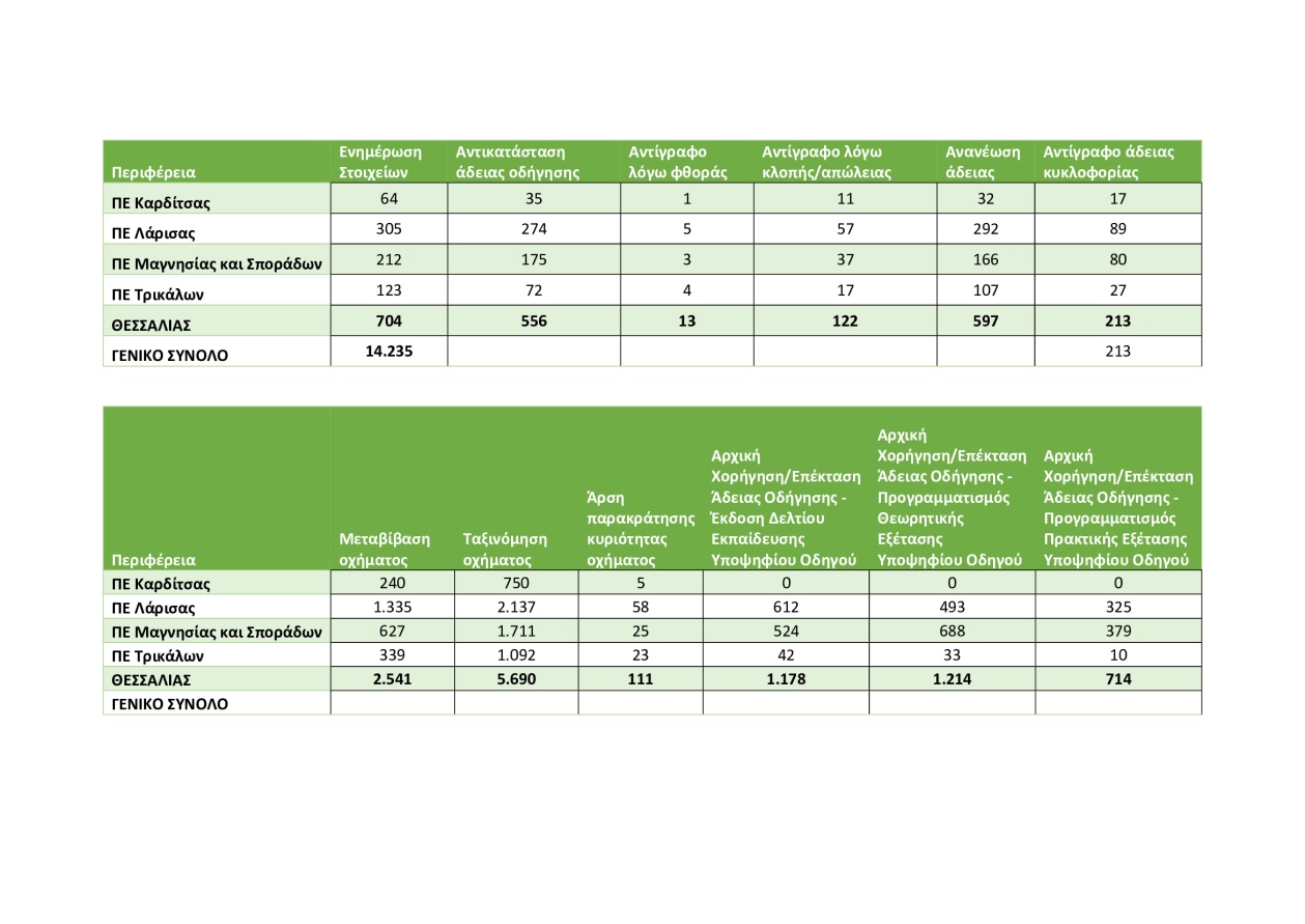 Σε νέα ψηφιακή εποχή έχουν εισέλθει εδώ και λίγο χρονικό διάστημα οι Διευθύνσεις Μεταφορών των τεσσάρων Περιφερειακών Ενοτήτων της Περιφέρειας Θεσσαλίας, καθώς από τις 15/10/25 μέχρι 31/3/2026 σε διάστημα μόλις 4,5 μηνών, έχουν διεκπεραιωθείψηφιακά τα αιτήματα 14.235 πολιτών και επιχειρήσεων της Θεσσαλίας, λόγω της μεγάλης μεταρρύθμισης δημιουργίας Κωδικού RF που υλοποιήθηκε, με αποτέλεσμα την πλήρη ψηφιακή εξυπηρέτηση των Θεσσαλών πολιτών μέσω της πλατφόρμας του GOV.grμε την χρήση Η/Υ και μέσω των ΚΕΠ όλης της Θεσσαλίας, για δεκαεπτά υπηρεσίες όπως : Ε