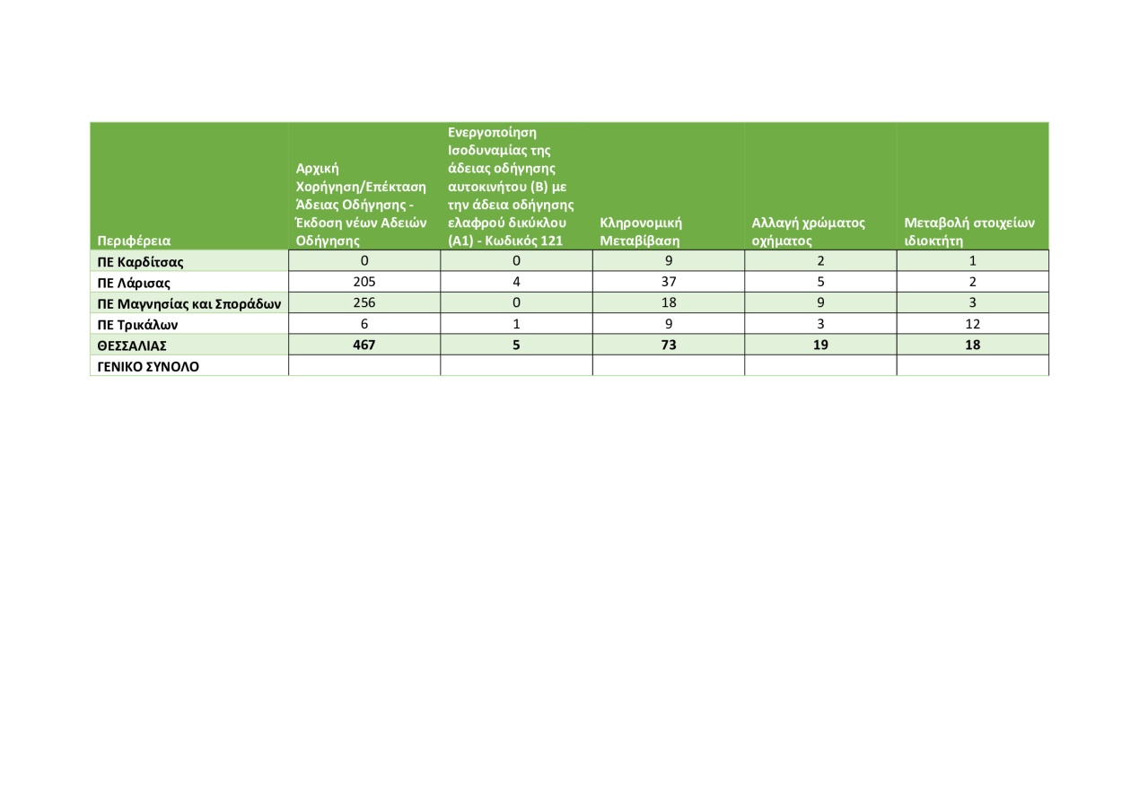 Είναι σαφές από τους πρώτους μήνες χρήσης της υπηρεσίας του ΚΩΔΙΚΟΥ RF και της δυνατότηταςψηφιακής εξυπηρέτησης μέσω του GOV.gr που υπήρξε, πως μειώθηκαν σημαντικά οι μετακινήσεις και ο συνωστισμός των πολιτών στις Διευθύνσεις Μεταφορών της Περιφέρειας Θεσσαλίας, ενώ μειώθηκε σημαντικά η ταλαιπωρία και το κόστος μετακίνησης για πολίτες απομακρυσμένων ορεινών και νησιωτικών περιοχών στα διοικητικά όρια της Θεσσαλίας. Τα αναλυτικά στοιχεία του πρώτου τετραμήνου εφαρμογής της μεταρρύθμισης που συντελεσθεί παρουσιάζονται ανάγλυφα στους παρακάτω πίνακες, ενώ πρέπει να σημειωθεί ότι μειώθηκε και ο όγκος των έγχαρτων φακέλων που στοιβάζονται επί χρόνια στους γεμάτους χώρους αρχείων των Διευθύνσεων Μεταφορών σε Λάρισα Βόλο, Τρίκαλα και Καρδίτσα.