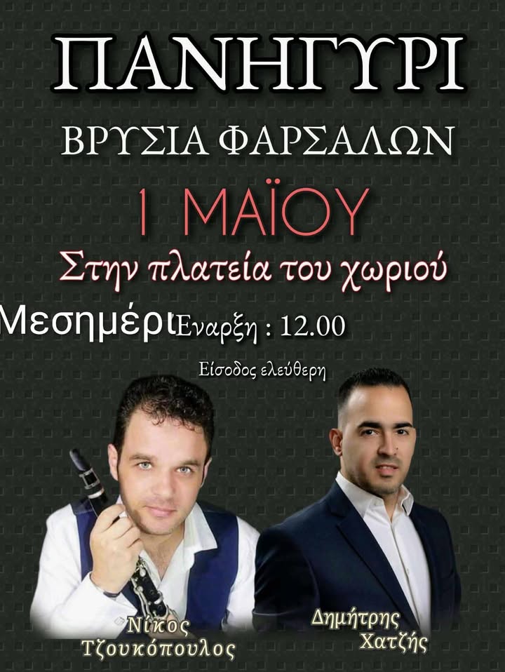 Γλέντι για τον εορτασμό της Πρωτομαγιάς διοργανώνεται στο χωριό Βρυσιά Φαρσάλων, προσκαλώντας τους κατοίκους και τους επισκέπτες της περιοχής να γιορτάσουν την ημέρα με δημοτική μουσική.