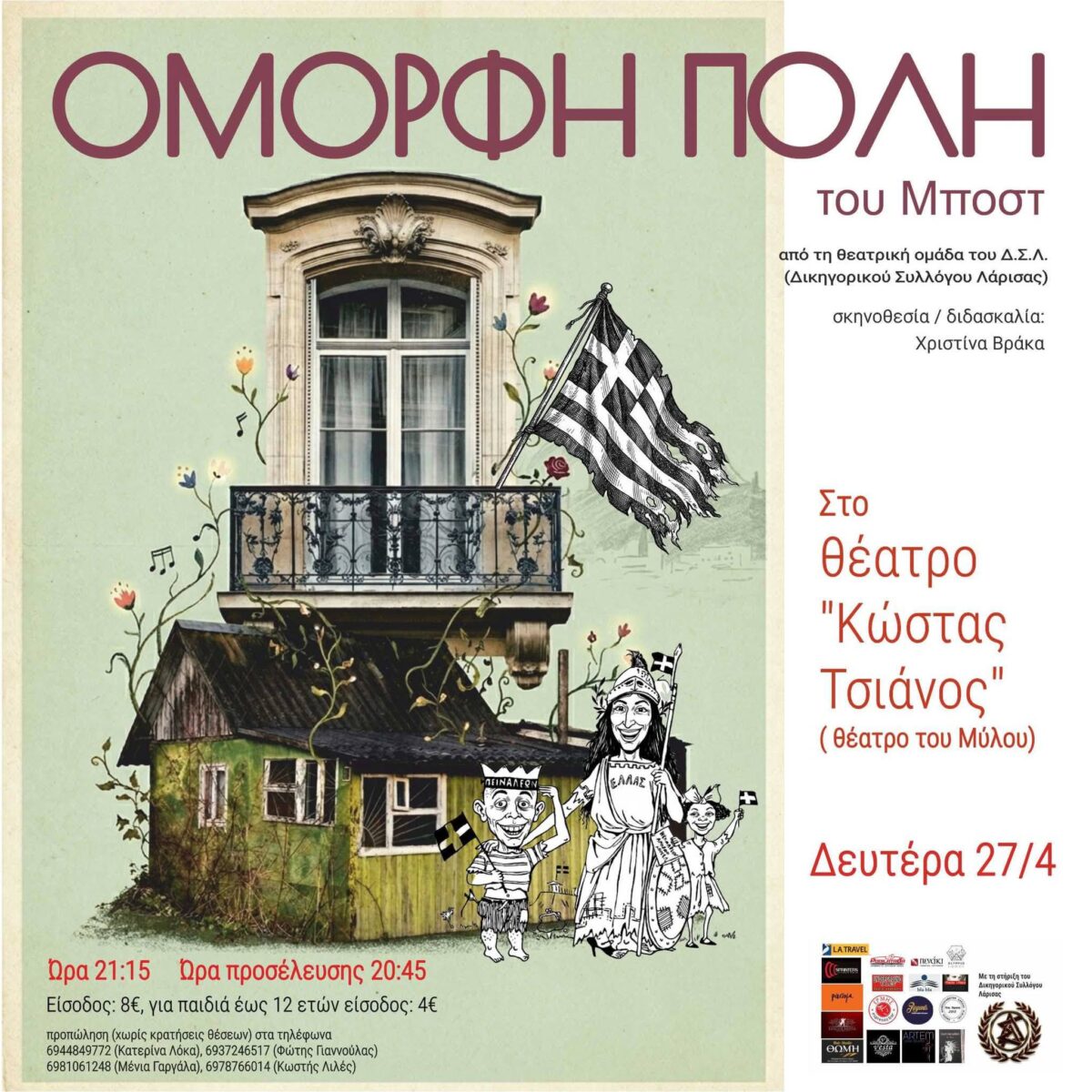 Τη Δευτέρα στις 27 Απριλίου 2026 και ώρα 21:15 η θεατρική ομάδα του Δικηγορικού Συλλόγου Λάρισας θα παρουσιάσει την παράσταση “Όμορφη Πόλη” του Μέντη Μποσταντζόγλου (Μποστ) σε σκηνοθεσία Χριστίνας Βράκα στο θέατρο Κώστας Τσιάνος στα πλαίσια του φεστιβάλ ερασιτεχνικών σκηνών “Όλη η πόλη μια σκηνή” που διοργανώνει το Θεσσαλικό Θέατρο.