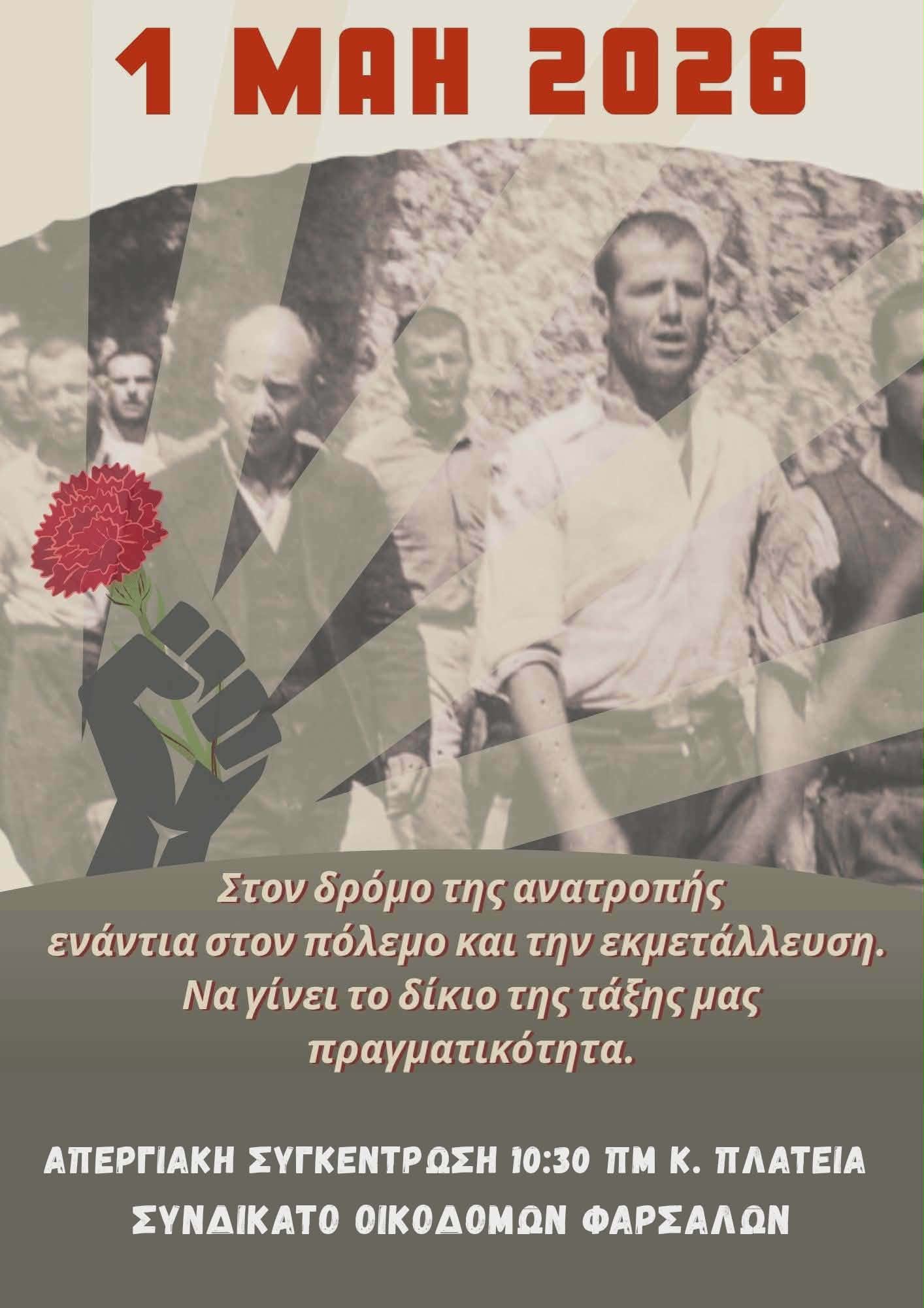 και στις απεργιακή συγκέντρωση που θα πραγματοποιηθεί την 1η Μάη στην Κ. Πλατεία των Φαρσάλων στις 10.30 π.μ.