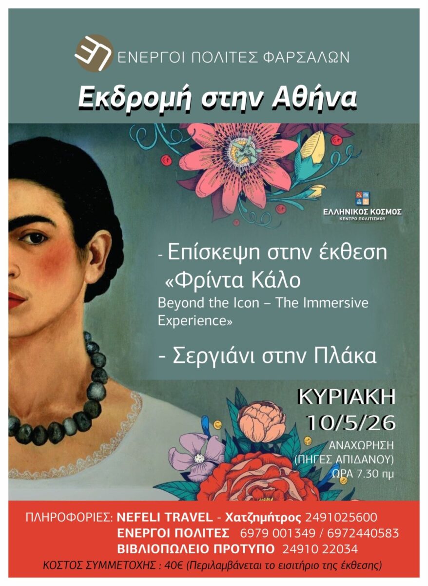 Το πρόγραμμα της εκδρομής περιλαμβάνει επίσκεψη στο Κέντρο Πολιτισμού «Ελληνικός Κόσμος» για την παρακολούθηση της έκθεσης «Φρίντα Κάλο: Beyond the Icon – The Immersive Experience». Θα ακολουθήσει σεργιάνι στα γραφικά σοκάκια της Πλάκας.